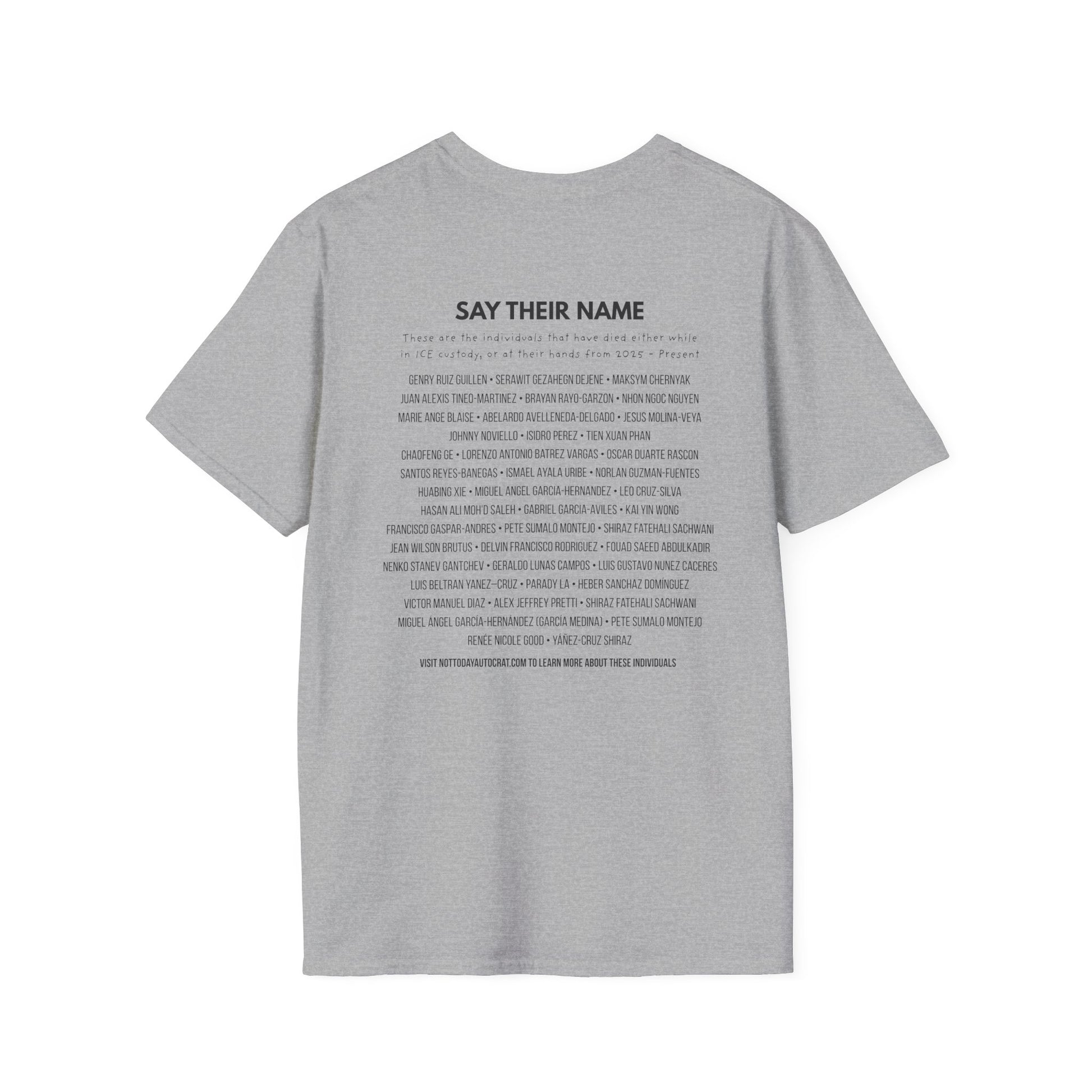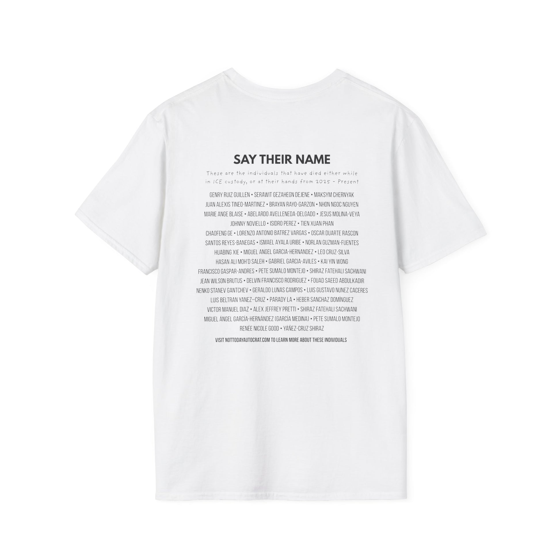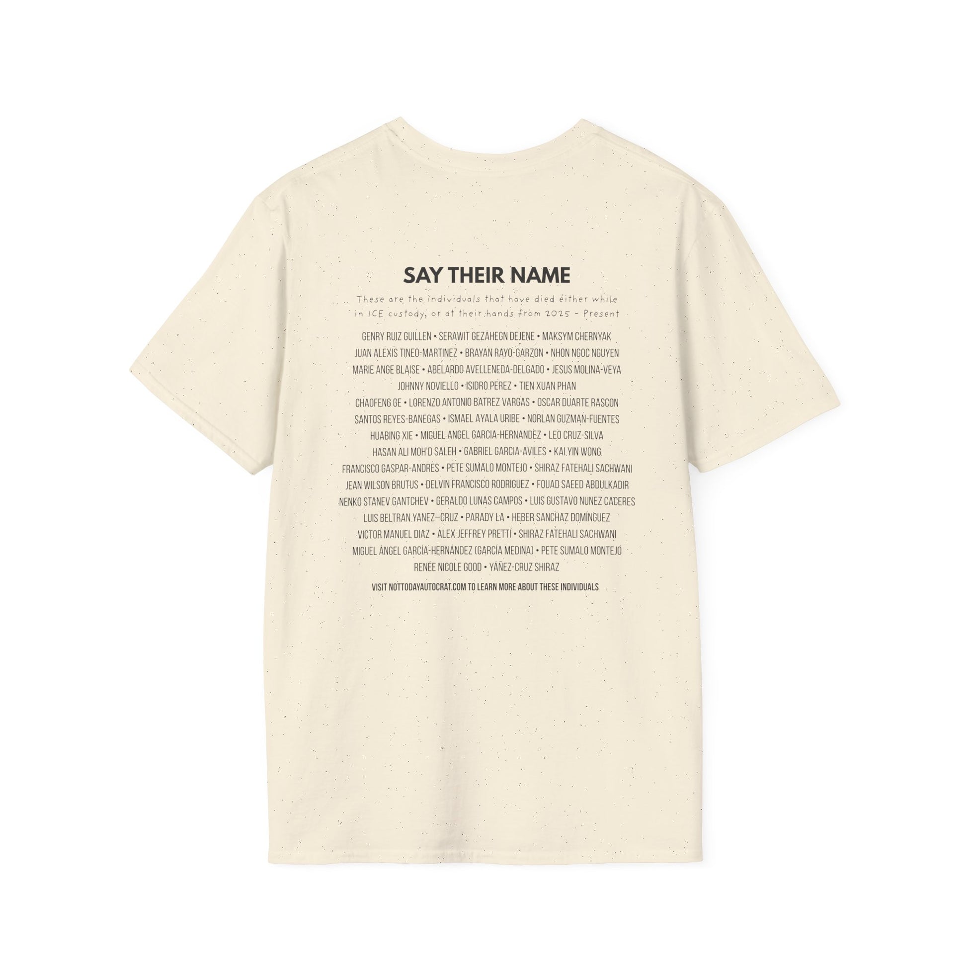 On the back of the shirt is a growing list of names: individuals who have lost their lives in connection with ICE from 2025 to the present. These names are not statistics: they are people. The list reflects documented cases and stands in for the many lives that may never be fully recorded.
